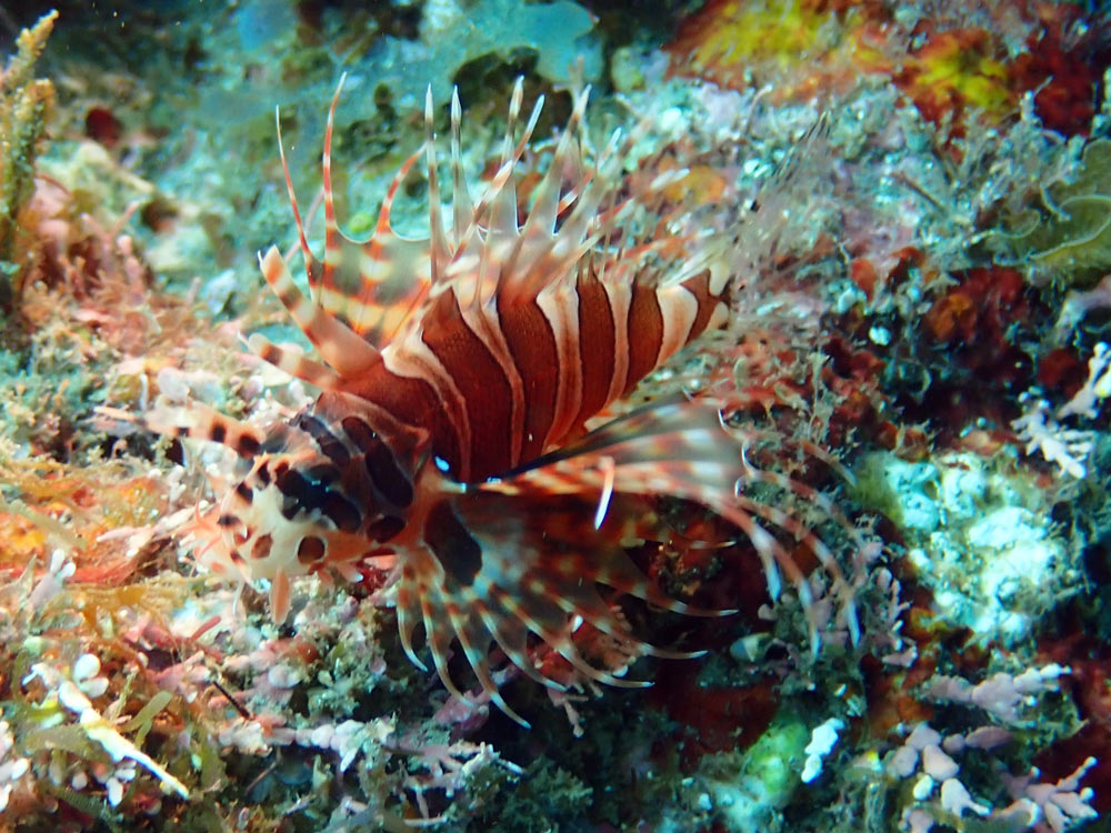 他のミノカサゴたちとの見分け方は、尾の付け根のT字状の模様やウチワのような胸ビレ。